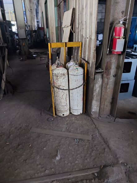 該企業的主要生產工藝為切割、焊接、漆等;主要生產設備為數控切割機、剪板機、電焊機、起重機等;涉及使用的危險化學品為氧[壓縮的]、乙炔、丙烷、二氧化碳[壓縮的]、醇酸樹脂漆、稀釋劑、混合氣(氬氣占80%,二氧化碳占20%)。
